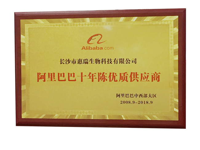 在2008-2018年十年間,長(zhǎng)沙市惠瑞生物科技股份有限公司榮獲阿里巴巴中西部大區(qū)頒發(fā)"阿里巴巴十年陳優(yōu)質(zhì)供應(yīng)商"獎(jiǎng)。